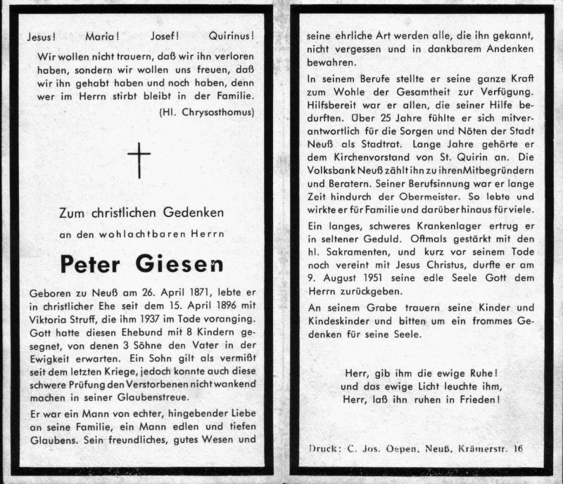 | ∞ 15.4.1896 Viktoria Struff, † 1937; 8 K., davon 3 †; 1 Sohn im 2. Weltkrieg vermißt; Stadtrat in Neuss; Mitgl. Kirchenvorst. St. Quirinus in Neuss; Innungs-Obermeister; langes, schweres Krankenlager |