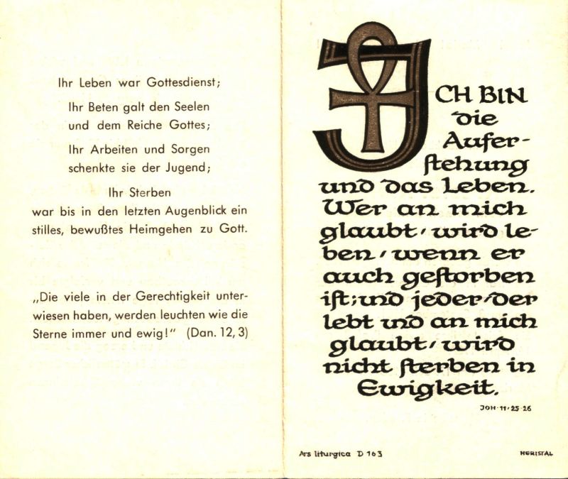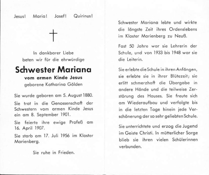 | 8.9.1901 Eintritt in Gen. d. Schwestern vom armen Kinde Jesu; 16.4.1907 Profeß; fast 50 J. Lehrerin an der Schule Marienberg in Neuss, 1933-48 deren Leiterin |