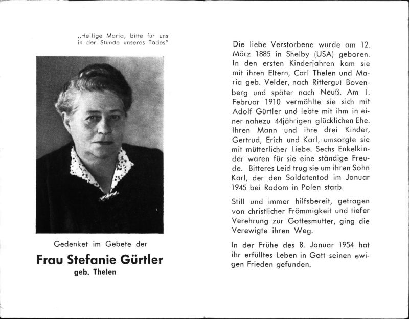 | In ersten Kinderjahren kam sie mit Eltern Carl Thelen u. Maria geb. Velder n. Rittergut Bovenberg u. später n. Neuss; ∞ 1.2.1910 Adolf Gürtler; 3 K.: Gertrud, Erich, Karl (Jan. 1945 im 2. Weltkrieg b. Radom in Polen gefallen); |