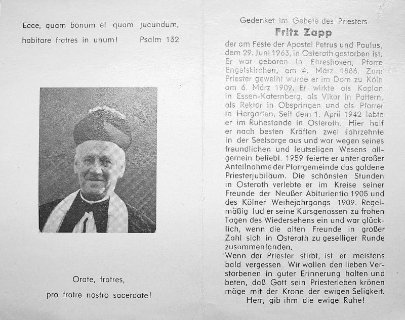 | Priesterweihe 6.3.1909 Köln; Kaplan in Essen-Katernberg, Vikar in Pattern, Rektor in Obspringen, Pfarrer in Hergarten; seit 1.4.1942 im Ruhestand in Osterath |