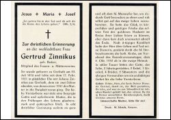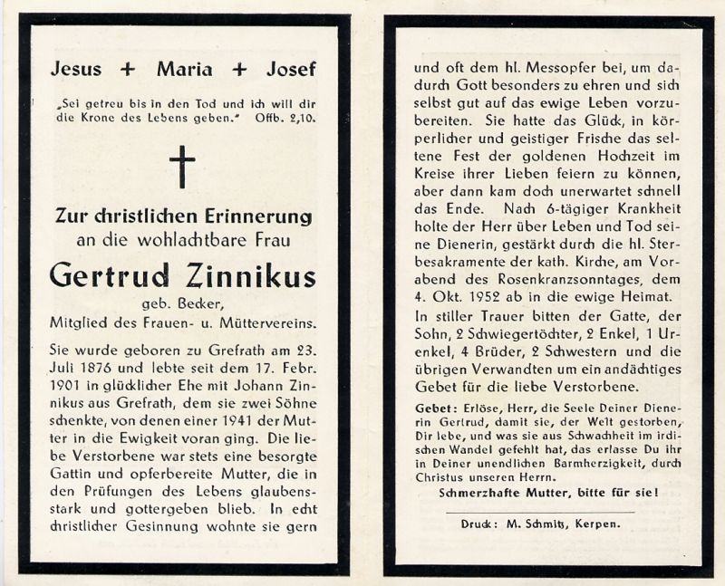 ∞ 17.2.1901 Johann Zinnikus aus Grefrath; 2 Söhne, davon 1 † 1941; Goldhochzeit |