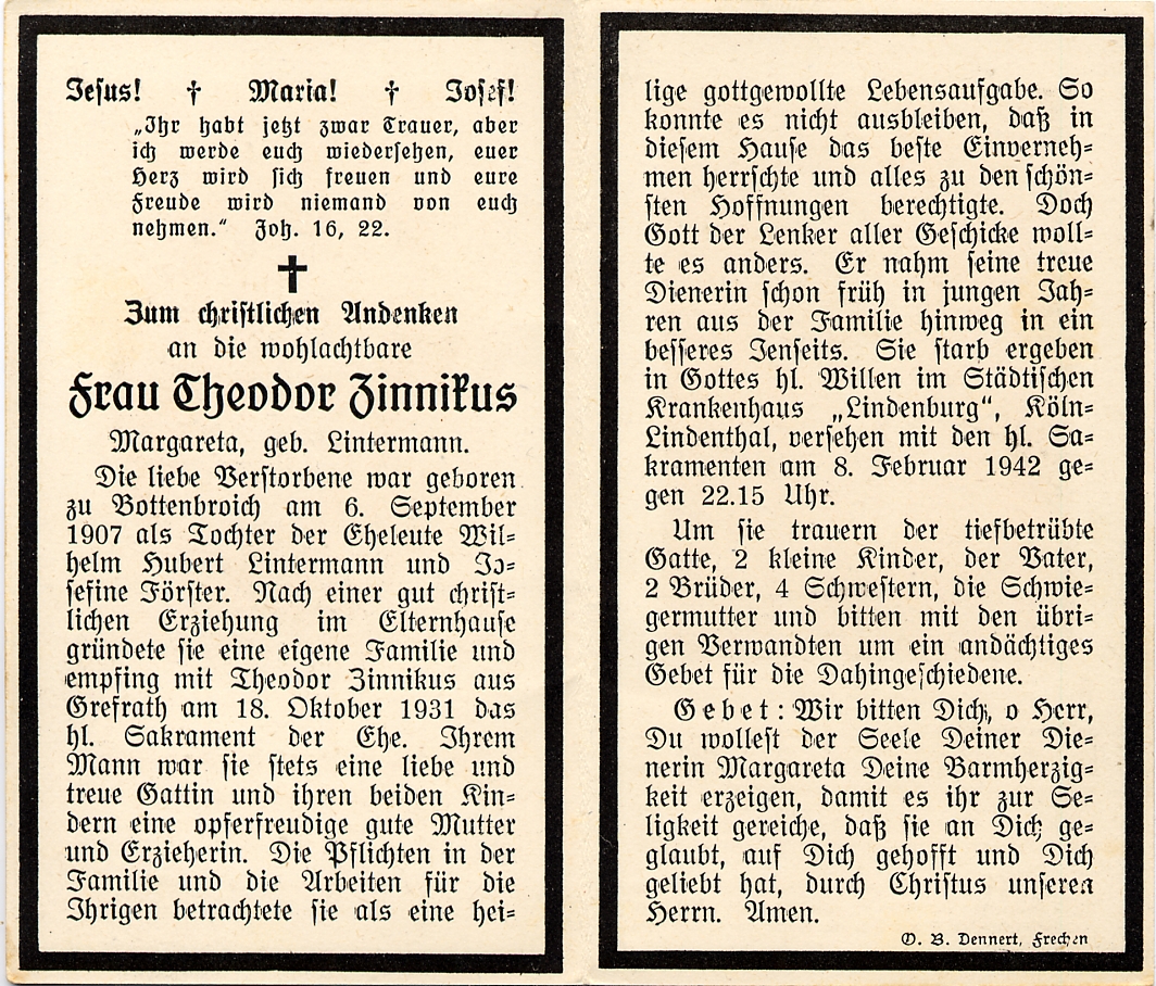 Eltern: Hubert Lintermann u. Josefine geb. Förster; ∞ 18.10.1931 Theodor Zinnikus aus Grefrath; 2 K. |