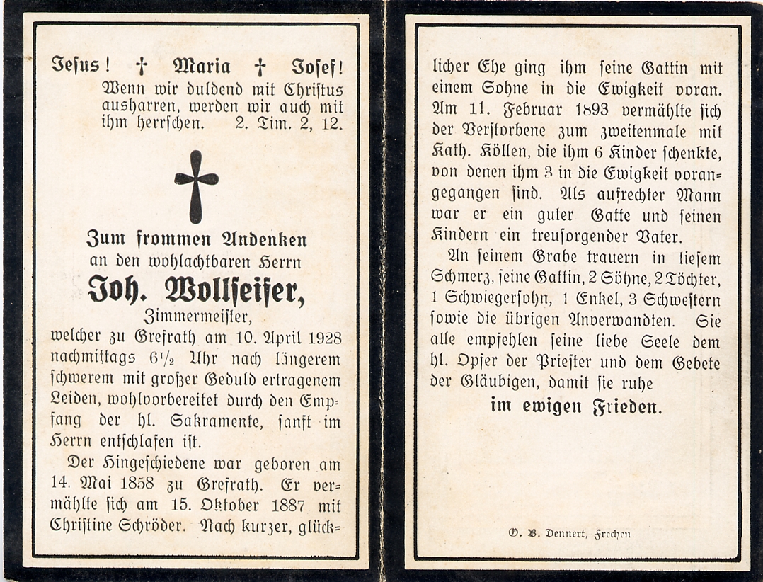 Zimmermeister; ∞ 15.10.1887 Christine Schröder, bald verstorben b. Geburt eines Sohnes; ∞ 11.2.1893 Katharina Köllen; 6 K., davon 3 †; |