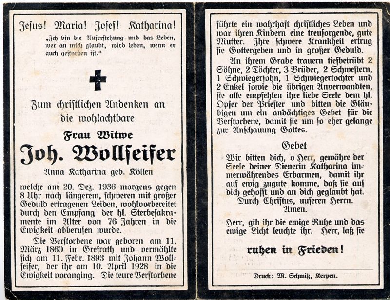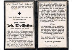 Längeres Leiden; ∞ 11.2.1893 Johann Wollseifer, † 10.4.1928; 4 überlebende Kinder |