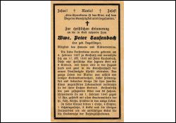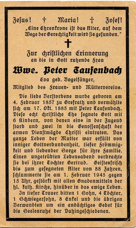 ∞ 17.10.1885 Peter Taufenbach; 6 K., davon 1 jung †; 2 Ordensschwestern; Lebensabend b. Tochter Gertrud |
