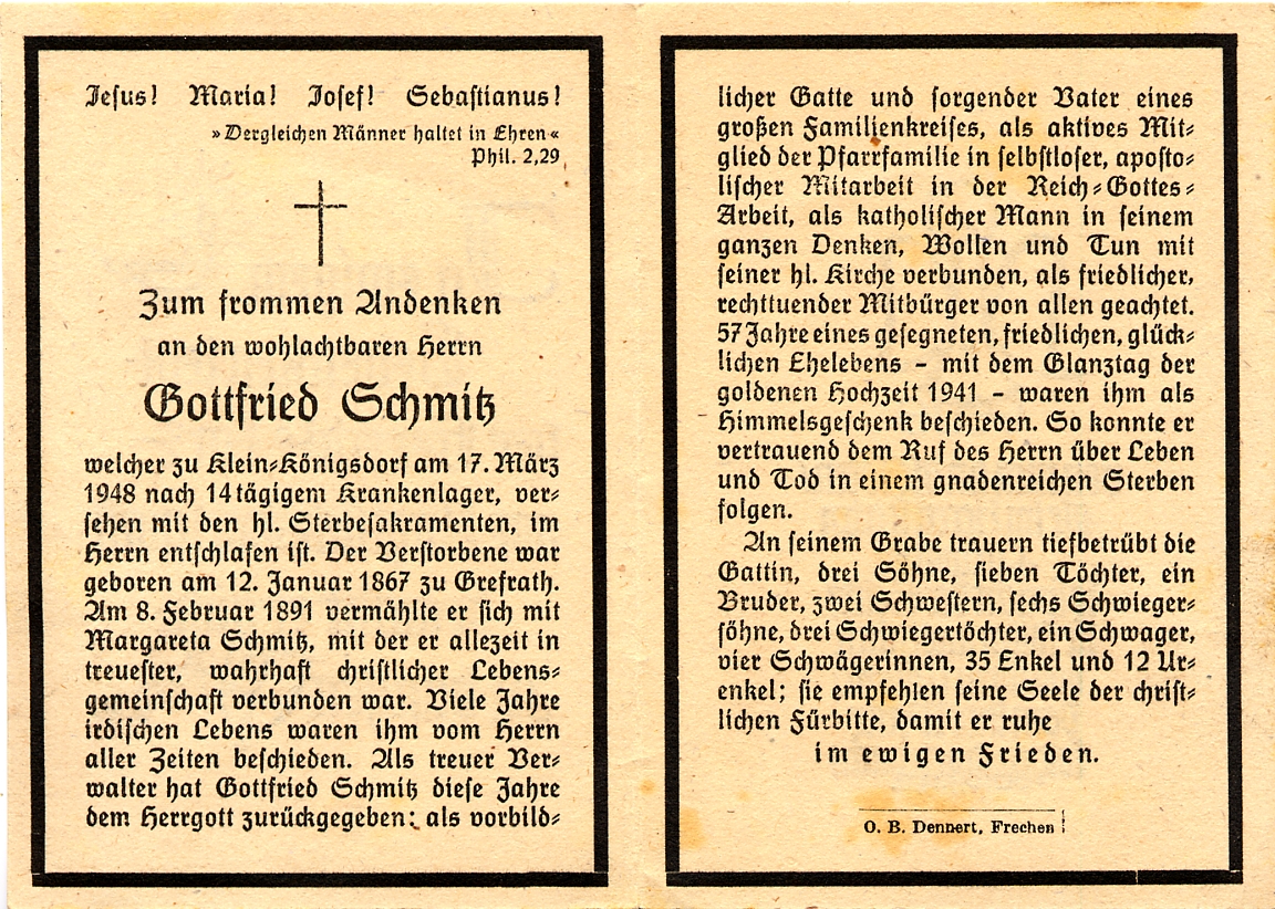 ∞ 8.2.1891 Margareta Schmitz; Goldhochzeit 1941; 10 überlebende Kinder |
