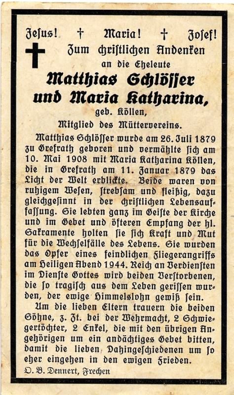 Opfer 2. Weltkrieg: Tod durch Fliegerangriff; ∞ 10.5.1908 Maria Katharina Köllen aus Grefrath; 2 Söhne, z. Zt. bei der Wehrmacht; Mitgl. Mütterverein |