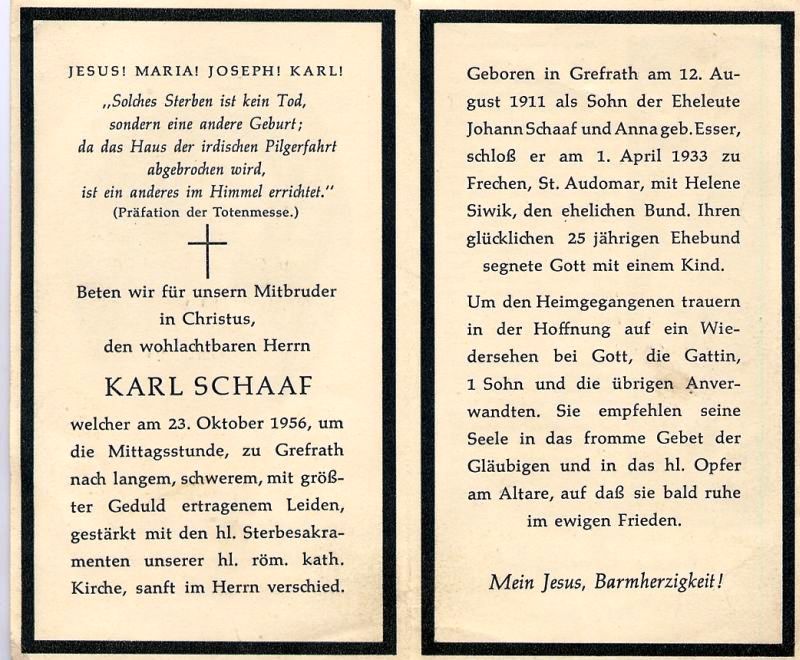 Eltern: Johann Schaaf u. Anna geb. Esser; ∞ 1.4.1933 in Frechen Helene Siwik; 1 K. |