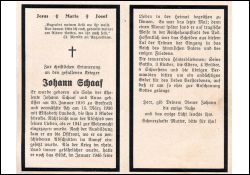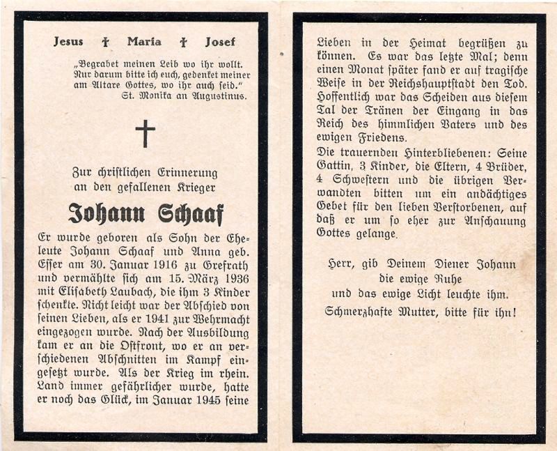 Gefallener 2. Weltkrieg; Eltern: Johann Schaaf u. Anna geb. Esser; ∞ 15.3.1936 Elisabeth Laubach; 3 K.; 1941 Einberufung; Jan. 1945 letzter Heimaturlaub |