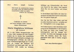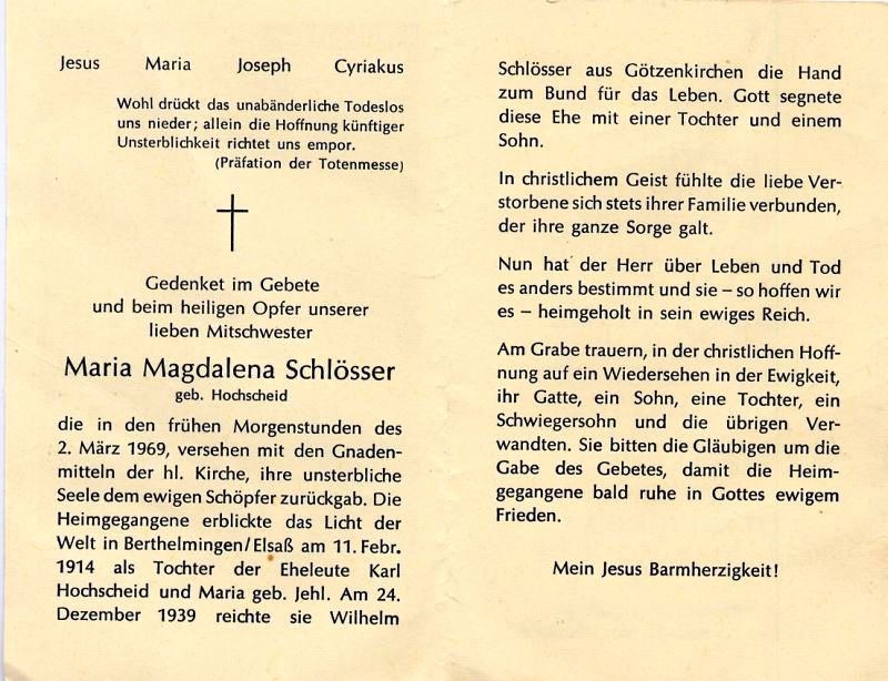 Eltern: Karl Hochscheid u. Maria geb. Jehl; ∞ 24.12.1939 Wilhelm Schlösser aus Götzenkirchen; 2 K. |