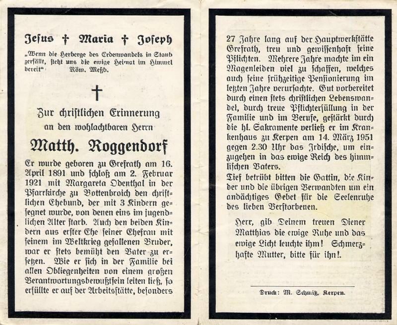 ∞ 2.2.1921 Margareta Odenthal in Bottenbroich (in 1. Ehe mit Bruder, gefallen im 1. Weltkrieg, 2 K); 3 K., davon 1 früh †; 27 J. auf Hauptwerkstätte in Grefrath |