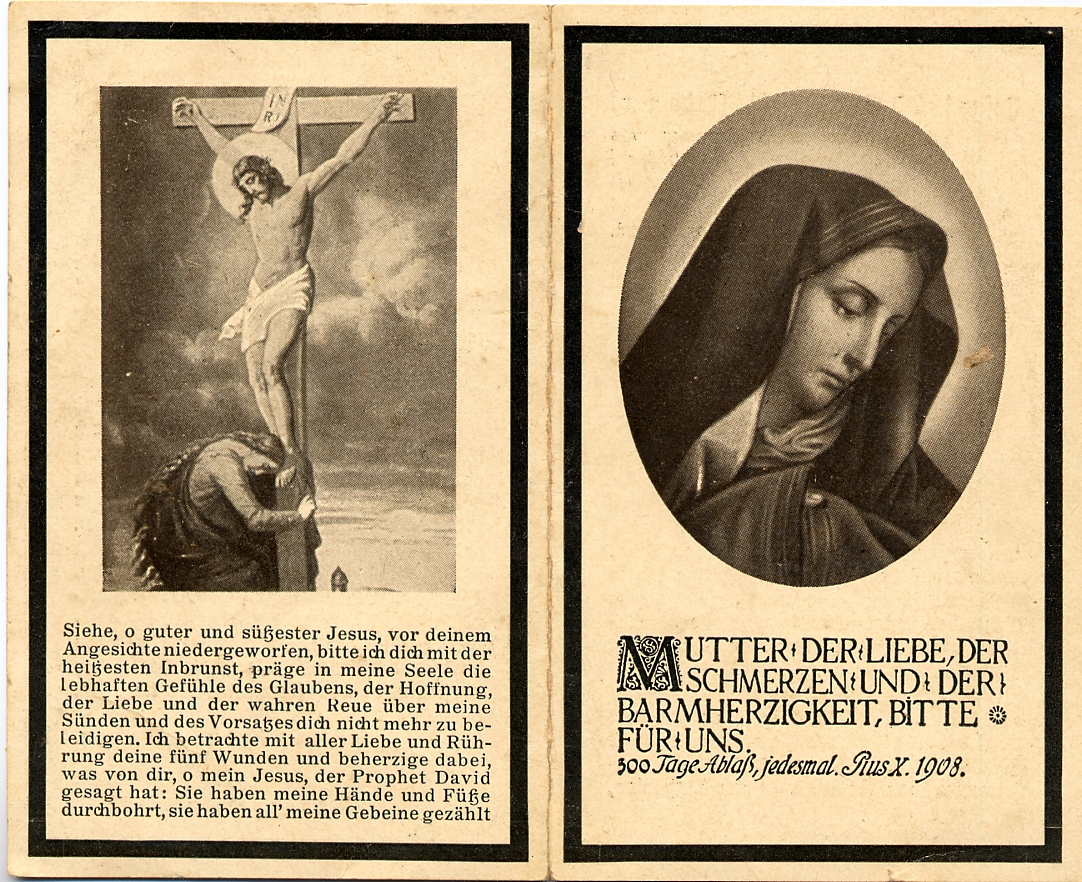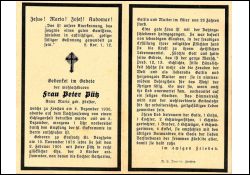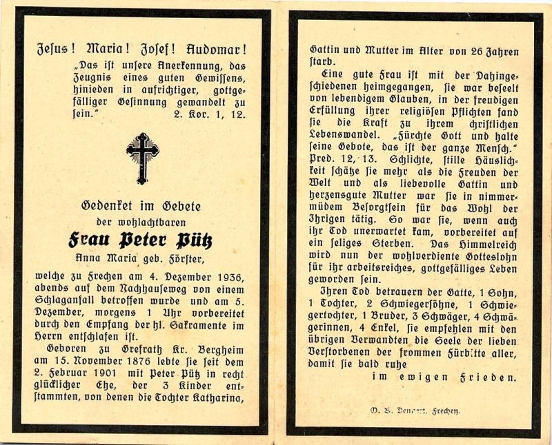 Schlaganfall auf dem Nachhauseweg; ∞ 2.2.1901 Peter Pütz; 3 K., davon Tochter Katharina, Gattin u. Mutter, mit 26 J. †; |