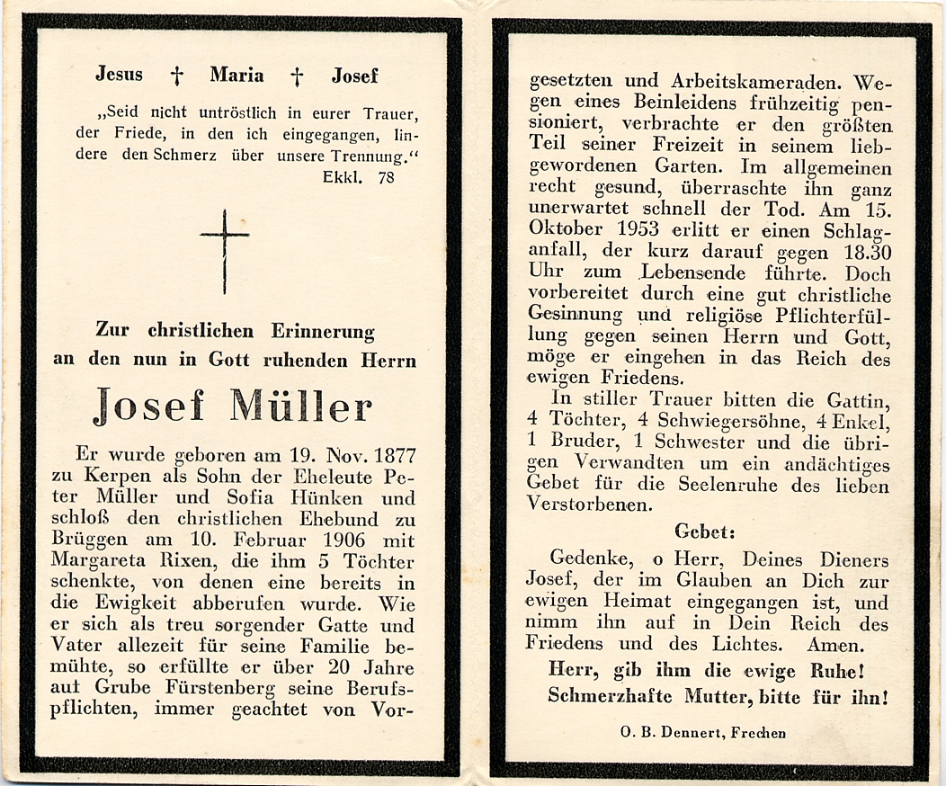 Schlaganfall; Eltern: Peter Müller u. Sofia geb. Hünken; ∞ 10.2.1906 Margareta Rixen; 5 Töchter, davon 1 †; 20 J. auf Grube Fürstenberg |