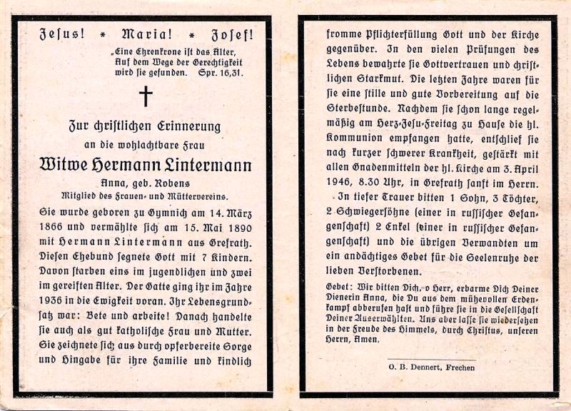 ∞ 15.5.1890 Hermann Lintermann, † 1935; 7 K., davon 1 früh, 2 im gereiften Alter †; Mitgl. Mütterverein |