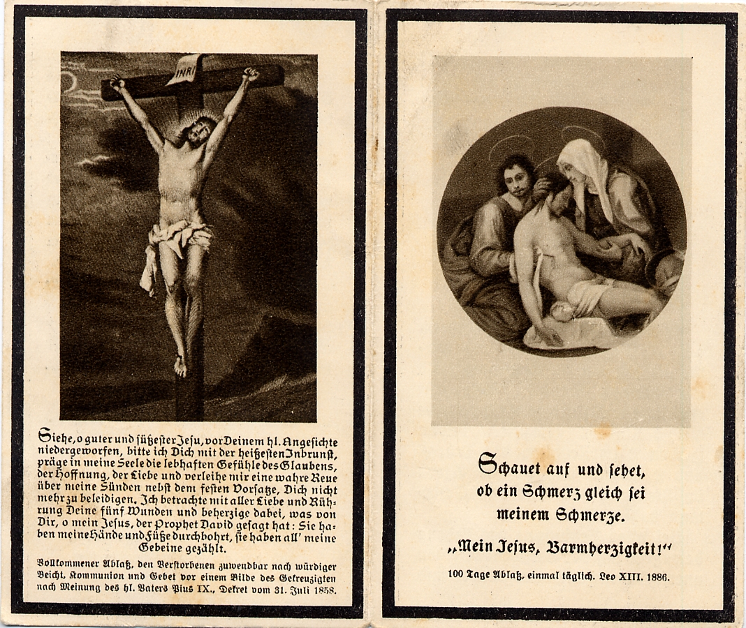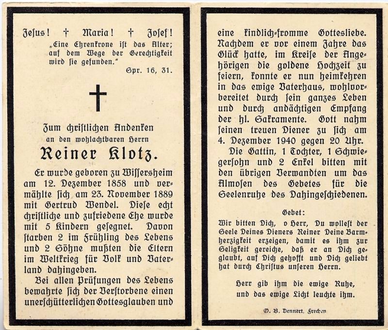 ∞ 23.11.1889 Gertrud Wendel; 5 K., davon 2 früh †; 2 Söhne im 1. Weltkrieg gefallen; Goldhochzeit (Druck in Frechen) |