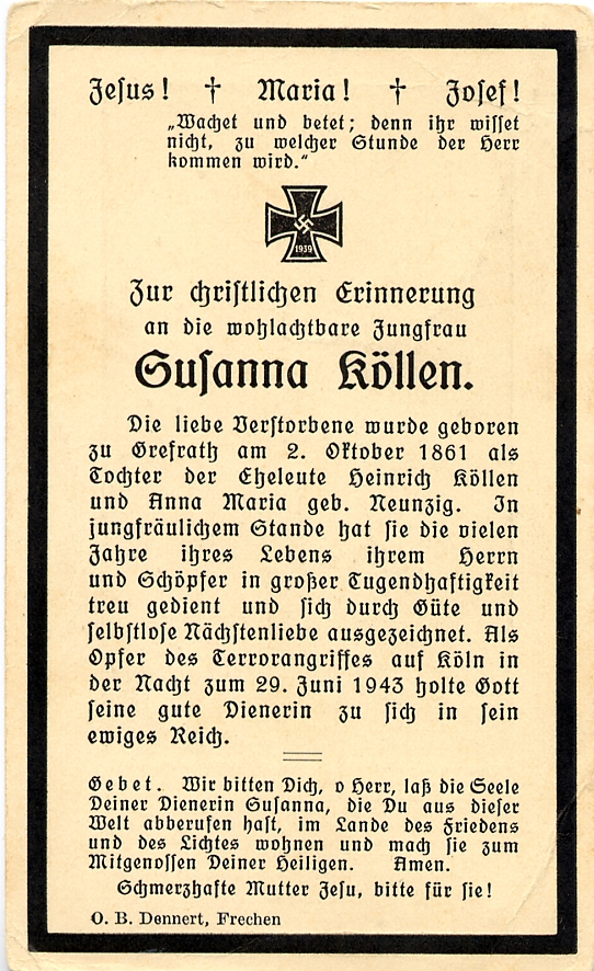 Opfer 2. Weltkrieg: Tod bei Terrorangriff auf Köln; Jungfrau; Eltern: Heinrich Köllen u. Anna Maria geb. Neunzig |
