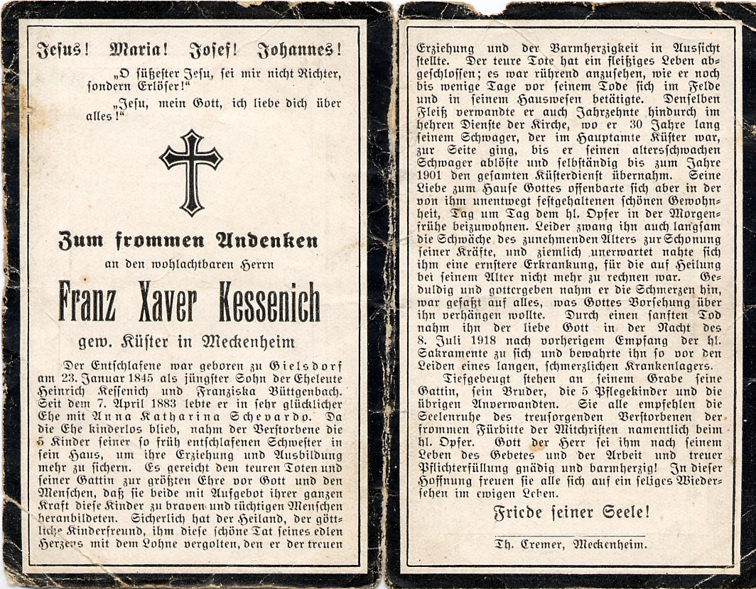 Küster in Meckenheim; Eltern Heinrich Kessenich u. Franziska geb. Büttgenbach; ∞ 7.4.1883 Anna Katharina Schevardo; kinderlos; nahm 5 K. seiner verstorbenen Schwester zu sich; 30 J. unterstützte er seinen Schwager im Küsteramt, löste ihn dann in diesem Amte bis 1901 ab; |
