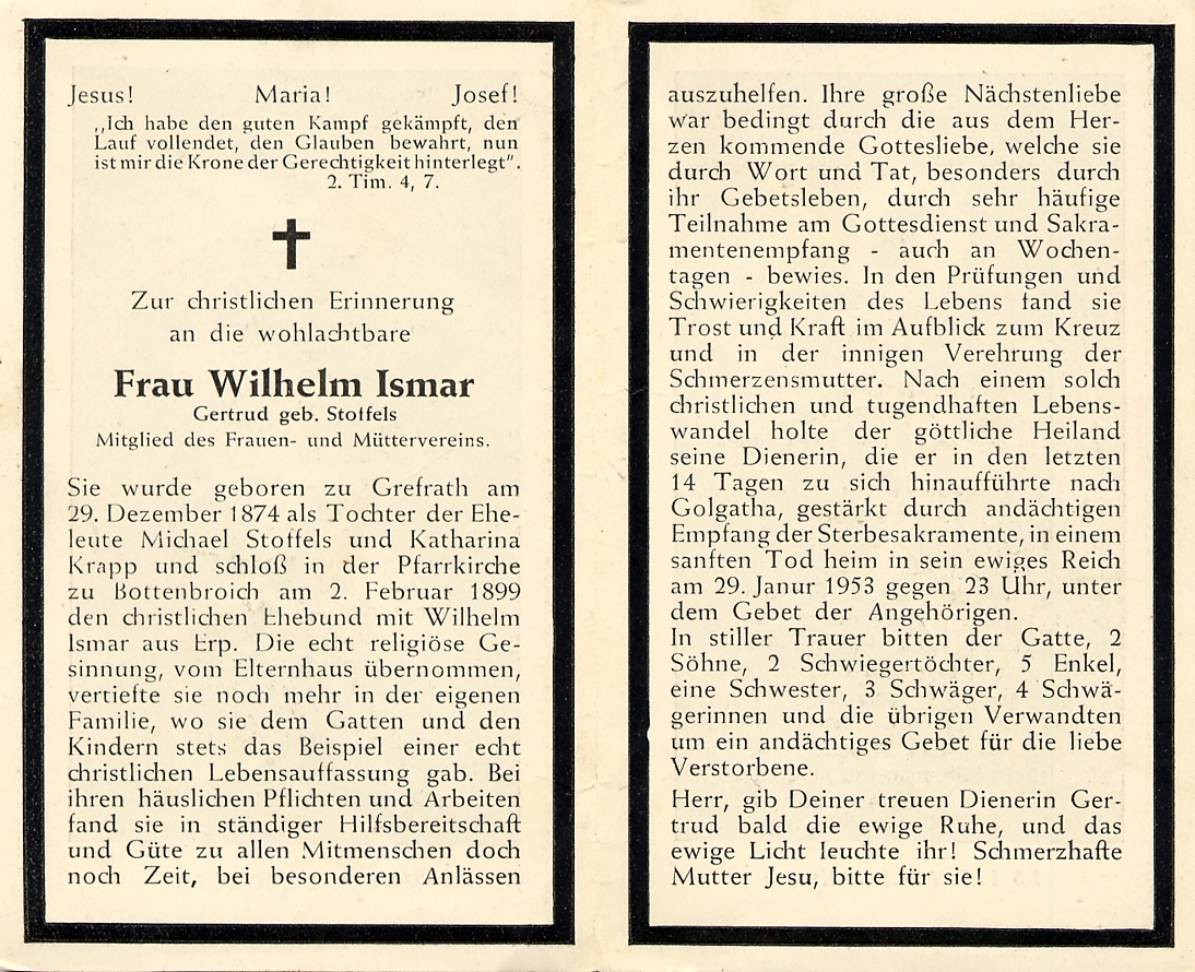Eltern: Michael Stoffels u. Katharina geb. Krapp; ∞ in Bottenbroich 2.2.1899 Wilhelm Ismar aus Erp; 2 überlebende Söhne |