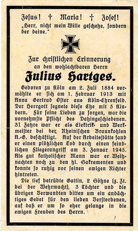 Opfer 2. Weltkrieg: Tod durch Fliegerangriff auf Arbeitsstätte: Rhein. Braunkohlen AG; 31 J. dort Elektrik- u. Werkmeister; ∞ 1.2.1913 Anna Gertrud Oster aus Köln-Ehrenfeld; 5 überlebende Kinder; davon 2 Söhne b.d. Wehrmacht |
