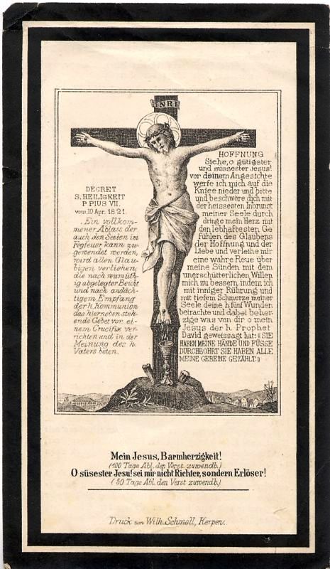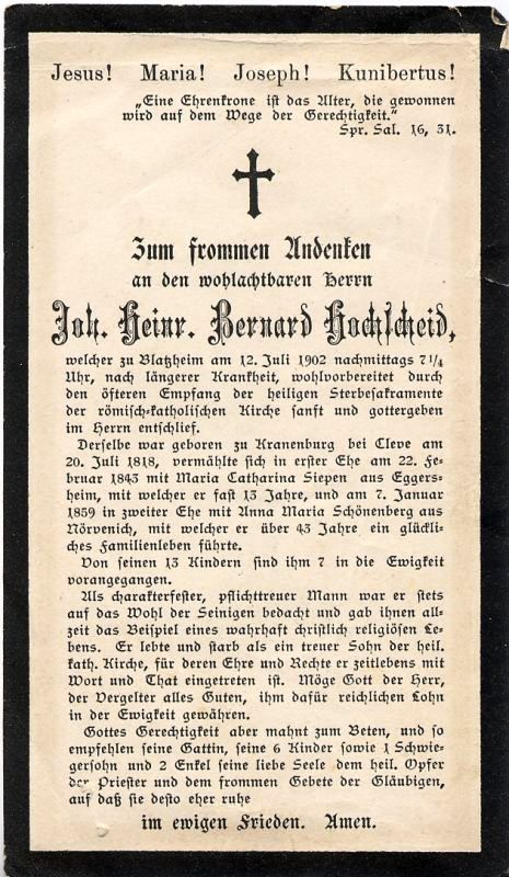 ∞ 22.2.1843 Maria Catharina Siepen aus Eggersheim, † nach fast 13 J.; ∞ 7.1.1859 Anna Maria Schönenberg aus Nörvenich; 13 K., davon 7 †; |