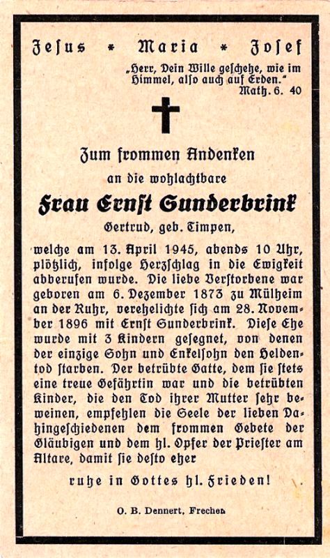 ∞ 28.11.1896 Ernst Sunderbrink; 3 K.; 1 Sohn und 1 Enkelsohn im 2. Weltkrieg gefallen (Druck in Frechen) |