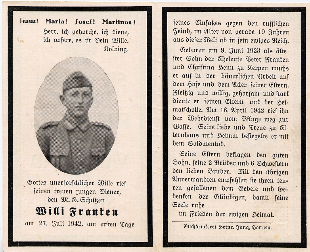 Gefallener 2. Weltkrieg; Eltern: Peter Franken u. Christina geb. Henn; Landwirtschaft; 16.4.1942 Einberufung |