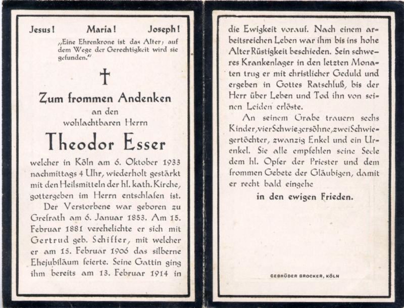 ∞ 15.2.1881 Gertrud Schiffer, † 13.2.1914; schweres Krankenlager in den letzten Monaten; 6 überlebende Kinder |