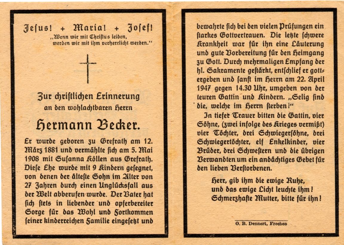 | ∞ 5.5.1908 Susanna Köllen aus Grefrath; 9 K.; ältester Sohn mit 27 J. tödlich verunglückt; 2 Söhne im 2. Weltkrieg vermisst |