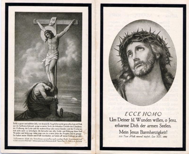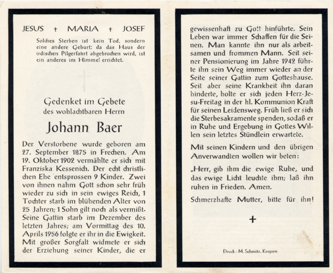 | ∞ 19.10.1902 Franziska Kessenich, † Dez. 1955; 9 K., davon 2 früh †, 1 Tochter mit 25 J. †; 1 Sohn im 2. Weltkrieg vermisst; Pensionierung 1942 |