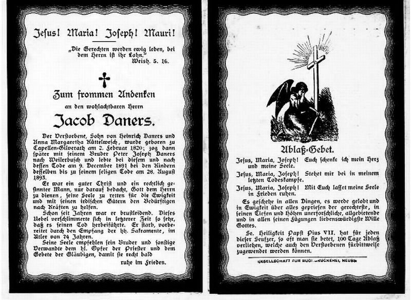 | Eltern: Heinrich Daners u. Anna Margaretha geb. Küttelwesch; zog später zu seinem Bruder Peter Joseph Daners nach Weilerbusch, † 9.12.1891; schon seit Jahren brustleidend |