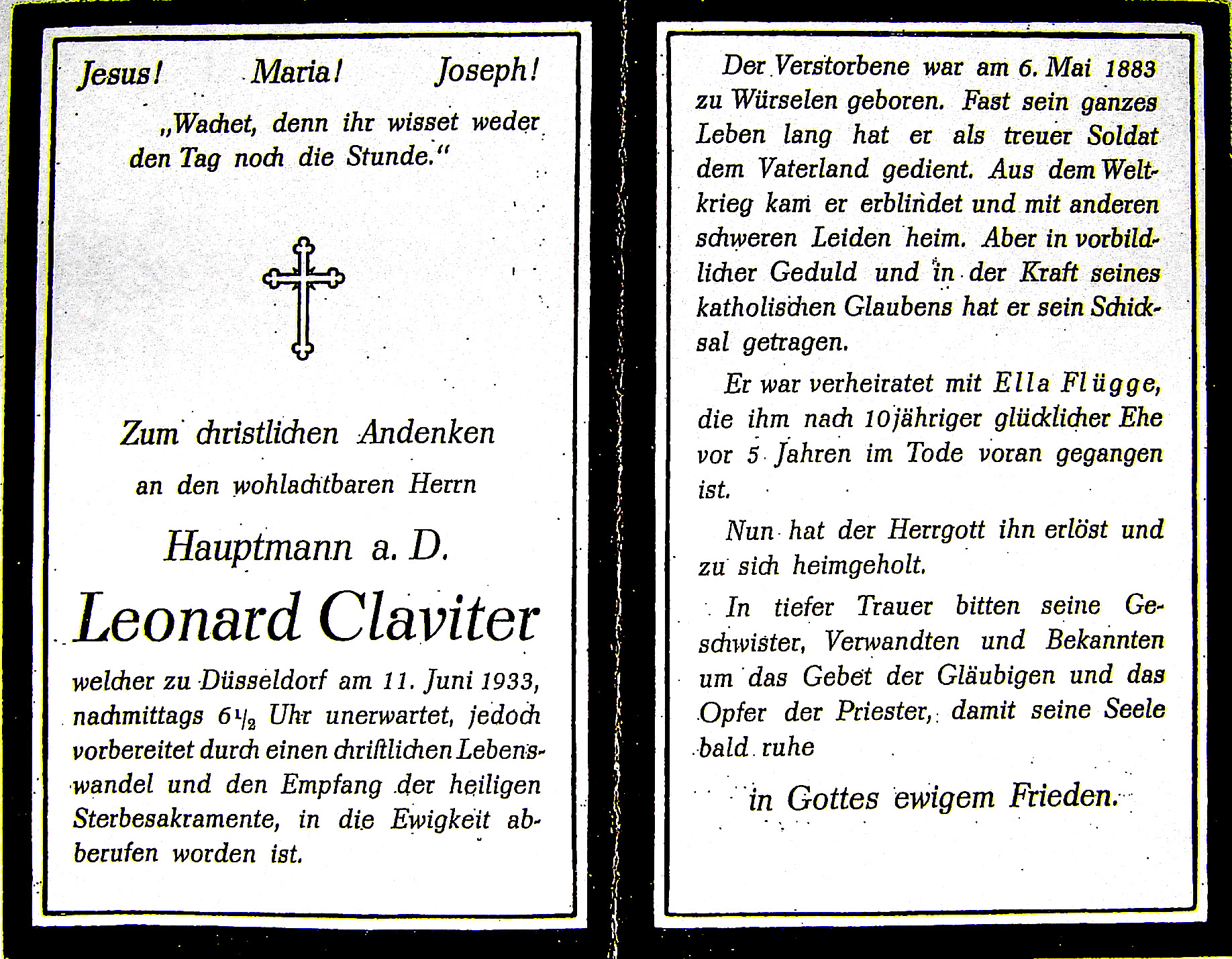 Hauptmann a. D.; kam erblindet u. mit anderen Leiden aus dem 1. Weltkrieg zurück; ∞ Ella Flügge, nach 10 J. Ehe vor 5 J. † |