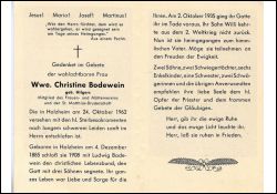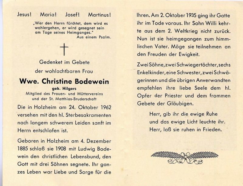 | Mitgl. Frauen- u. Mütterverein, St. Matthias-Bruderschaft; ∞ 1908 Ludwig Bodewein, † 2.10.1935; 3 Söhne; Sohn Willi im 2. Weltkrieg gefallen |