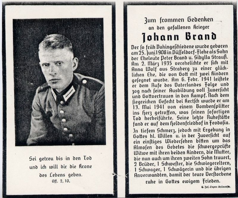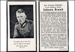 | Gefallener 2. Weltkrieg; Eltern: Peter Brand u. Sibylla geb. Strauß; ∞ 2.3.1935 Anna Wolf aus Straberg; 2 K.; 6.2.1941 Einberufung zur Wehrmacht; Heldenfriedhof in Feodosia |