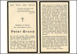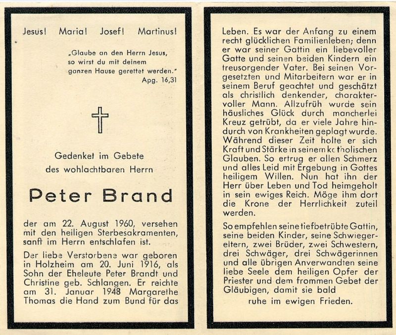 | Eltern: Peter Brandt (Brand?) u. Christine geb. Schlangen; ∞ 31.1.1948 Margarethe Thomas; 2 K.; viele Jahre durch Krankheit geplagt; |