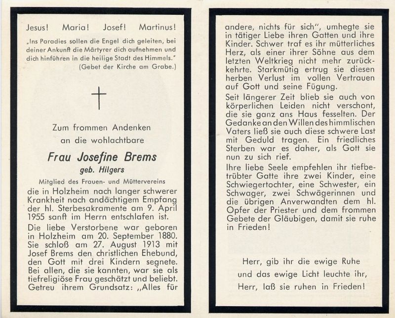 Mitgl. Frauen- u. Mütterverein; lange, schwere Krankheit, ganz ans Haus gefesselt; ∞ 27.8.1913 Josef Brems; 3 K.; |