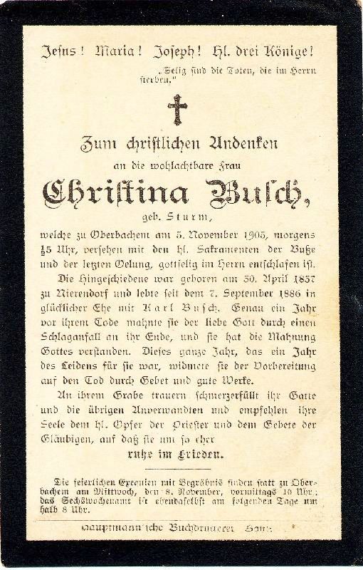 ∞ 7.9.1886 Karl Busch; vor 1 J. Schlaganfall; 1 Jahr des Leidens |