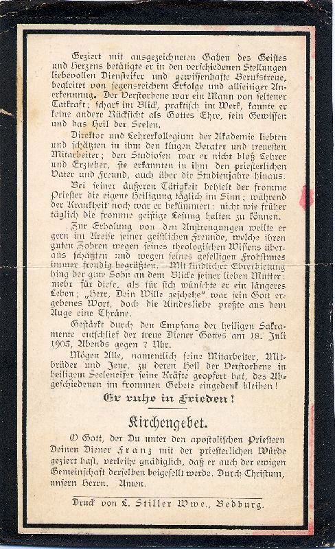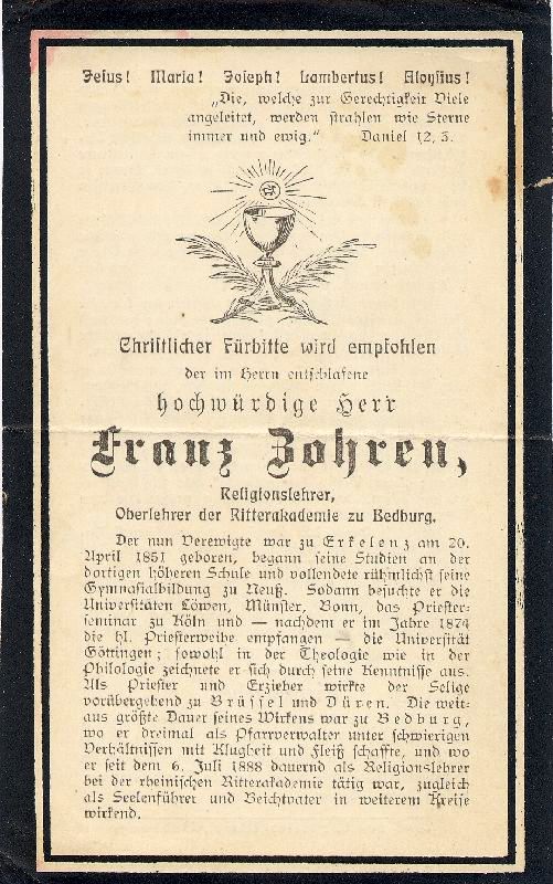 Priesterweihe Köln 1874; wirkte als Priester u. Erzieher zunächst in brüssel und Düren; die längste Zeit seines Lebens wirkte er in Bedburg, wo er dreimal als Pfarrverwalter im Kulturkampf tätig war; seit 6.7.1888 dauernd als Religionslehrer an der Rhein. Ritterakademie in Bedburg tätig; |
