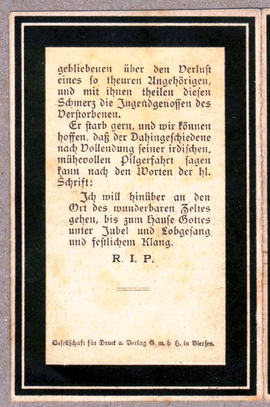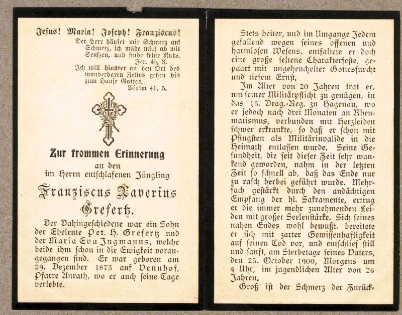 Jüngling; Eltern: Peter Hubert Grefertz u. Maria Eva geb. Ingmanns, beide †; mit 20 J. Militärdienst zu Hagenau; nach 3 Monaten Rheumatismus, verbunden mit Herzleiden, als Militärinvalde in die Heimat entlassen; Druck in Viersen; Wohnort: Neersen |