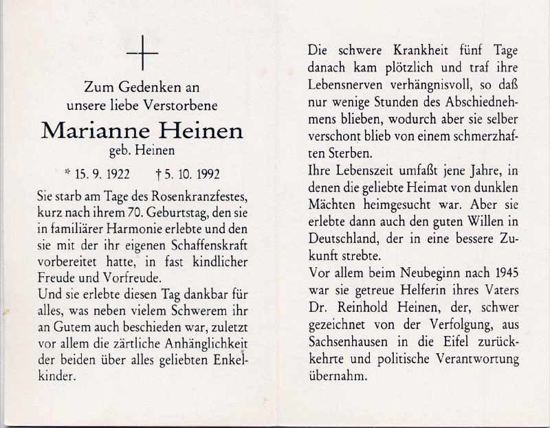 Vater: Dr. Reinhold Heinen, der, schwer gezeichnet von der Verfolgung durch die Nationalsozialisten, aus dem KZ Sachsenhausen in die Eifel zurückkehrte und politische Verantwortung übernahm; später Herausgeber der Kölnischen Rundschau |