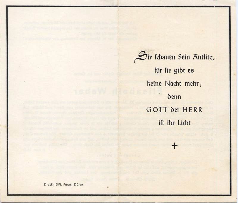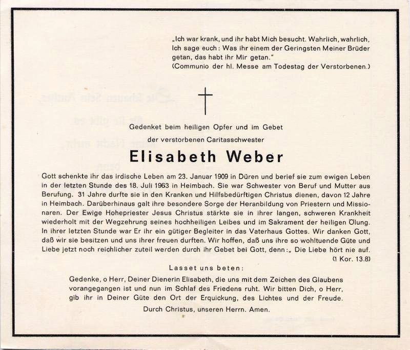 Caritasschwester; 31 J. in der Krankenpflege, davon 12 J. in Heimbach; lange, schwere Krankheit |