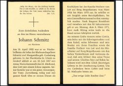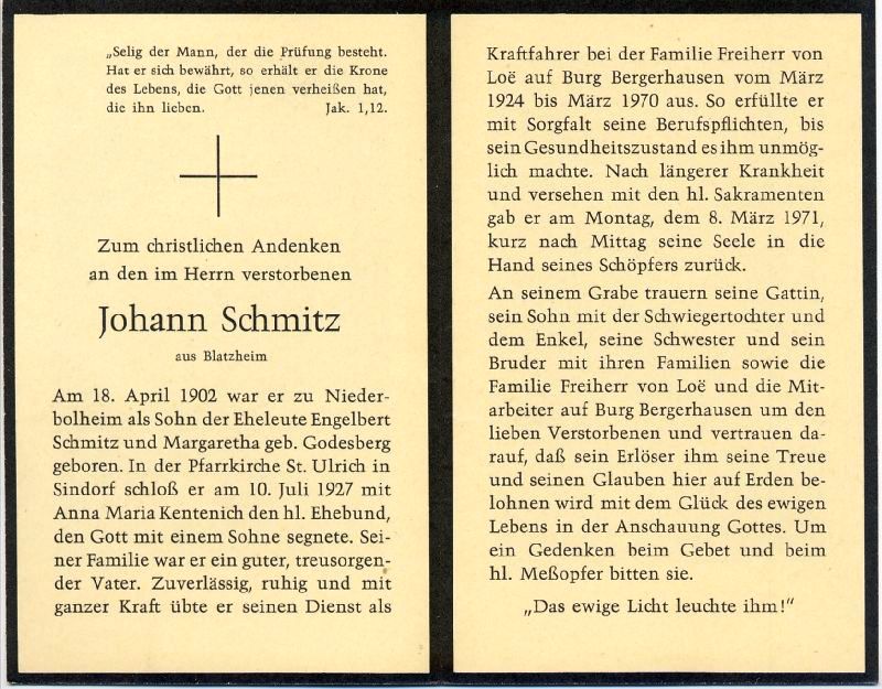 Eltern: Engelbert Schmitz u. Margaretha geb. Godesberg; ∞ 10.7.1927 in Sindorf Anna Maria Kentenich; 1 Sohn; 1924-70 Kraftfahrer bei Freiherr von Loe auf Burg Bergerhausen |