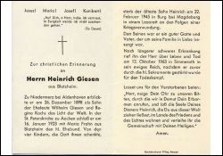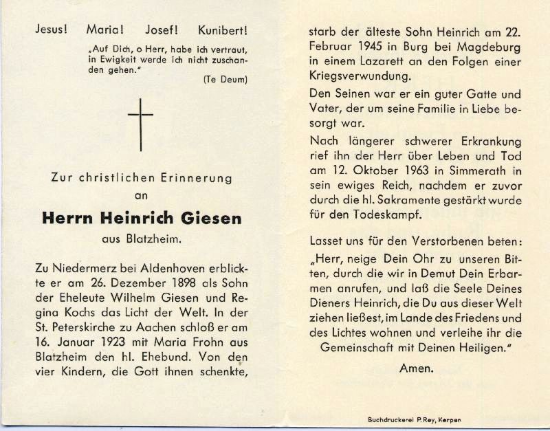 Eltern: Wilhelm Giesen u. Regina Kochs; ∞ in Aachen 16.1.1923 Maria Frohn aus Blatzheim; 4 K., davon Sohn Heinrich † 22.2.1945 im Lazarett in Burg b. Magdeburg (Gefallener 2. Weltkrieg) |