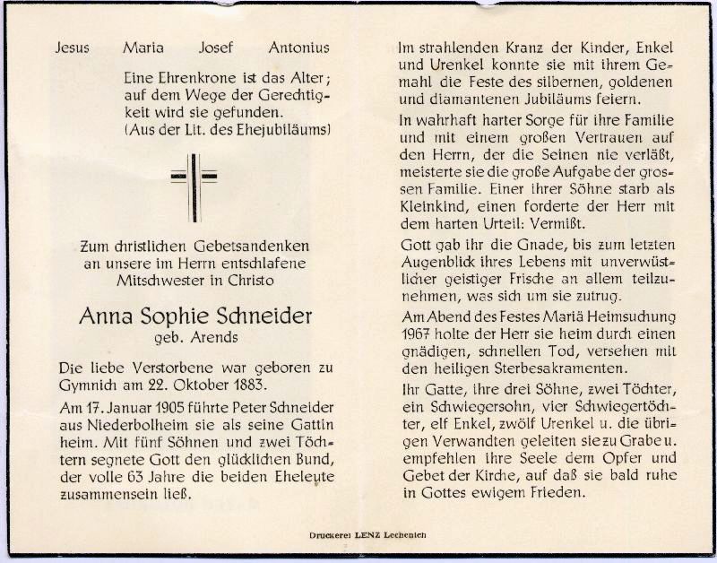 ∞ 17.1.1905 Peter Schneider aus Niederbolheim; 7 K., davon 1 früh †; 1 Sohn im 2. Weltkrieg vermisst; Druck in Lechenich |