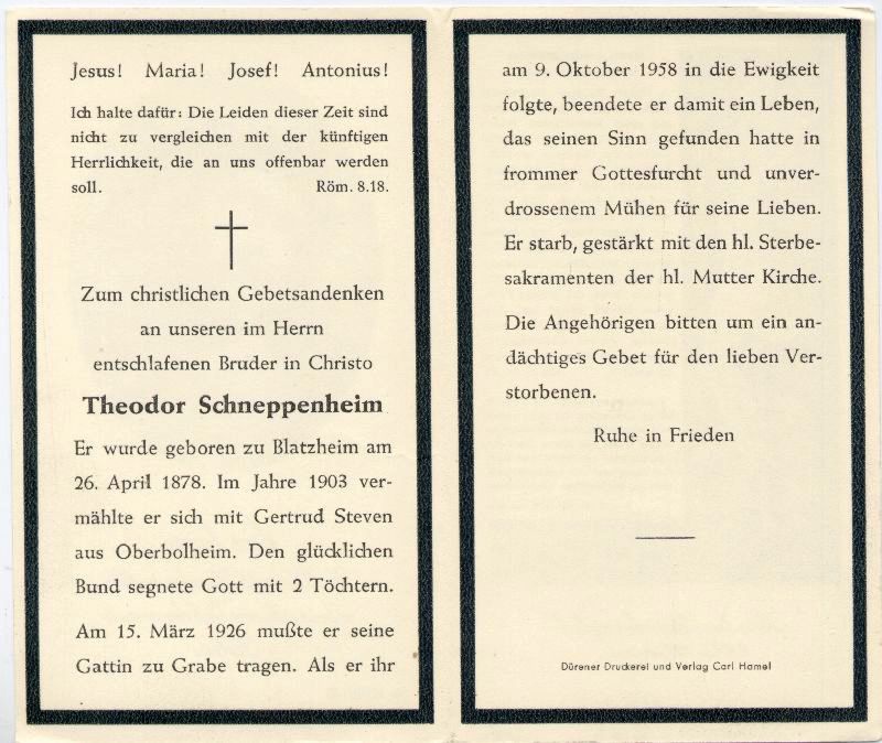 ∞ 1903 Gertrud Steven aus Oberbolheim, † 15.3.1926; 2 Töchter; Druck in Düren |