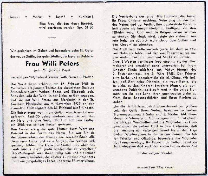 Eltern: Schneidermeister Michael Papst u. Elisabeth geb. Sons; ∞ 9.11.1929 Willi Peters aus Blatzheim; 3 K.; Druck in Kerpen |