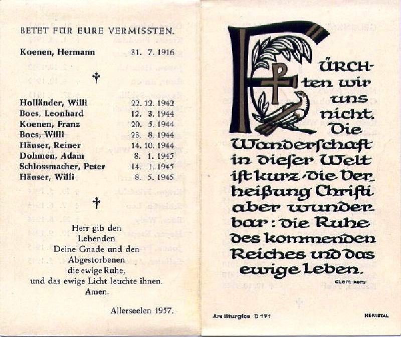Gefallener 2. Weltkrieg; gemeinsamer Totenzettel für alle Gefallenenen der Gemeinde Evinghoven, Alleseelen 1957 |