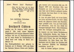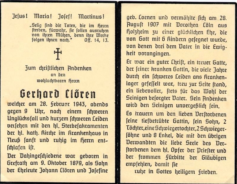 | Eltern: Johann Clören u. Josefine geb. Loenen; ∞ 28.8.1907 Dorothea Cöln aus Holzheim; 6 K., davon 3 †; Gattin seit vielen Jahren ans Krankenlager gefesselt; |