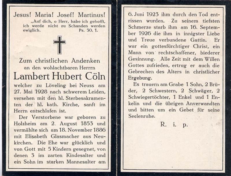 | ∞ 18.11.1886 Elisabeth Glasmacher aus Neukirchen, † 16.9.1926; 5 K., davon 3 früh †; 1 Sohn im starken Mannesalter am 6.6.1923 †; |