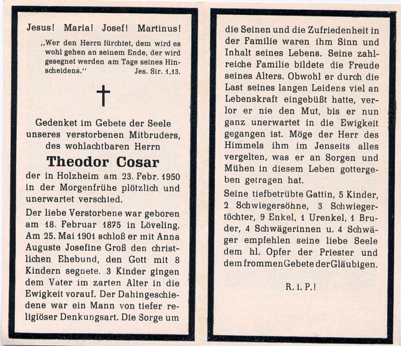 | ∞ 25.5.1901 Anna Auguste Josefine Groß; 8 K., davon 3 früh †; langes Leiden; |