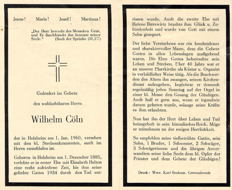 | ∞ Elisabeth Helten, † 1934; ∞ Helene Bierwirtz; 1 Sohn; 40 J. Küster u. Organist an St. Martinus in Holzheim; |